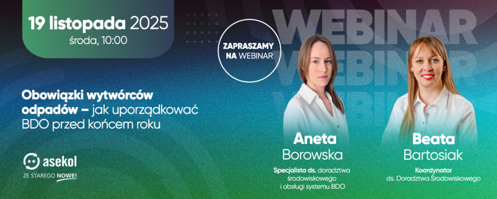 Asekol zaprasza na specjalistyczny webinar poświęcony najważniejszym obowiązkom wytwórców odpadów oraz zasadom prawidłowego prowadzenia ewidencji w systemie BDO. Spotkanie odbędzie się 19 listopada o godzinie 10:00 i jest skierowane do klientów Asekol oraz osób zainteresowanych pogłębieniem swojej wiedzy z zakresu gospodarki odpadami.